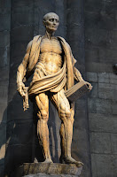 第三站為世界第三大教堂:米蘭大教堂,先來看看大教堂外觀,教堂可以免費參觀,阿批不是基督或天主教徒,但主要參觀教堂的原因是教堂的特殊設計或陳列物,像教堂的彩繪玻璃,是阿批的最愛。而米蘭大教堂內還有陳列著名教宗的〝金身〞,還有被剝皮而殉教的聖人(有圖有真相,祂身上披的是自己的皮)、ㄧ堆掛畫、且有些柱子上都有特殊的雕刻塑像,幾可亂真,這些才是阿批真正的目的。